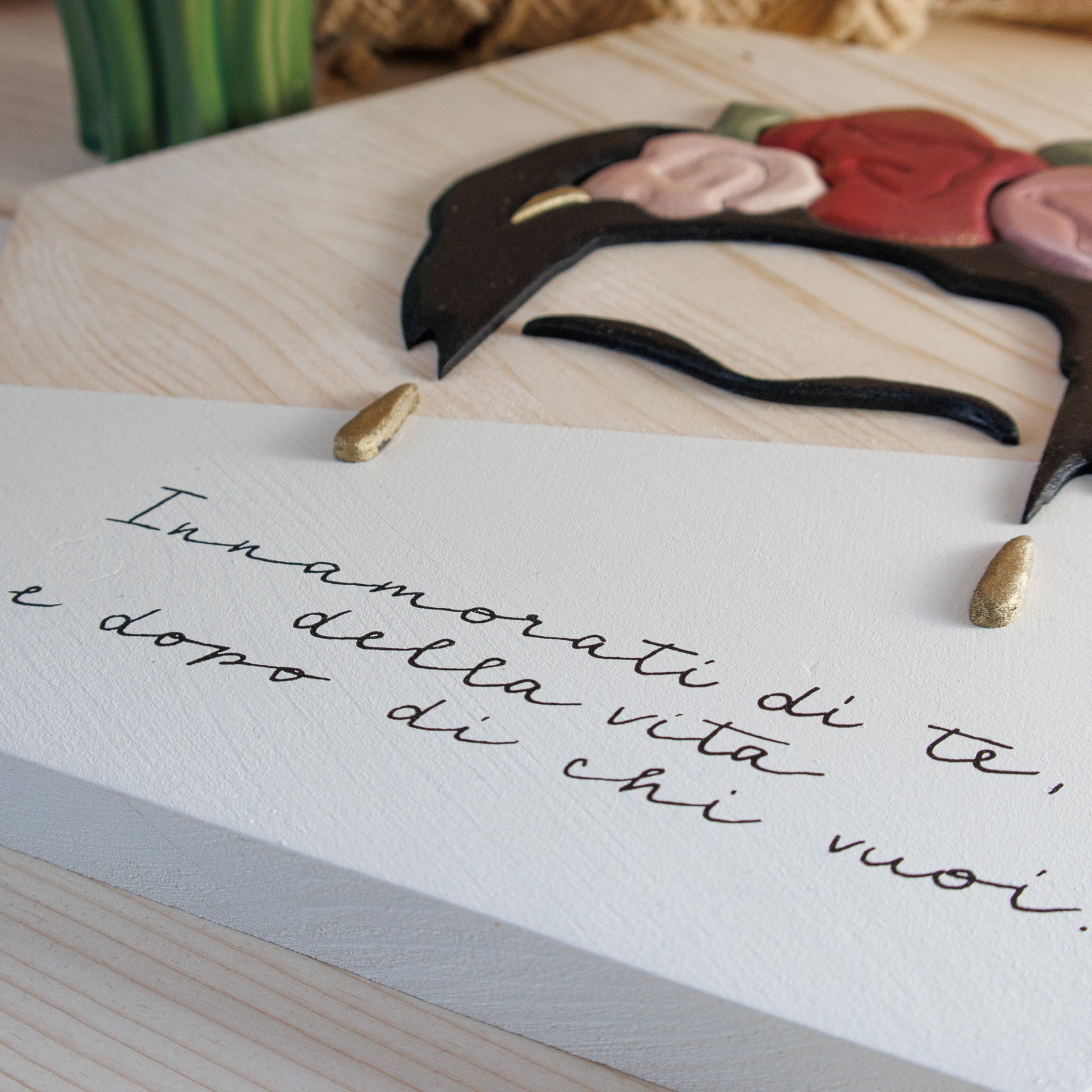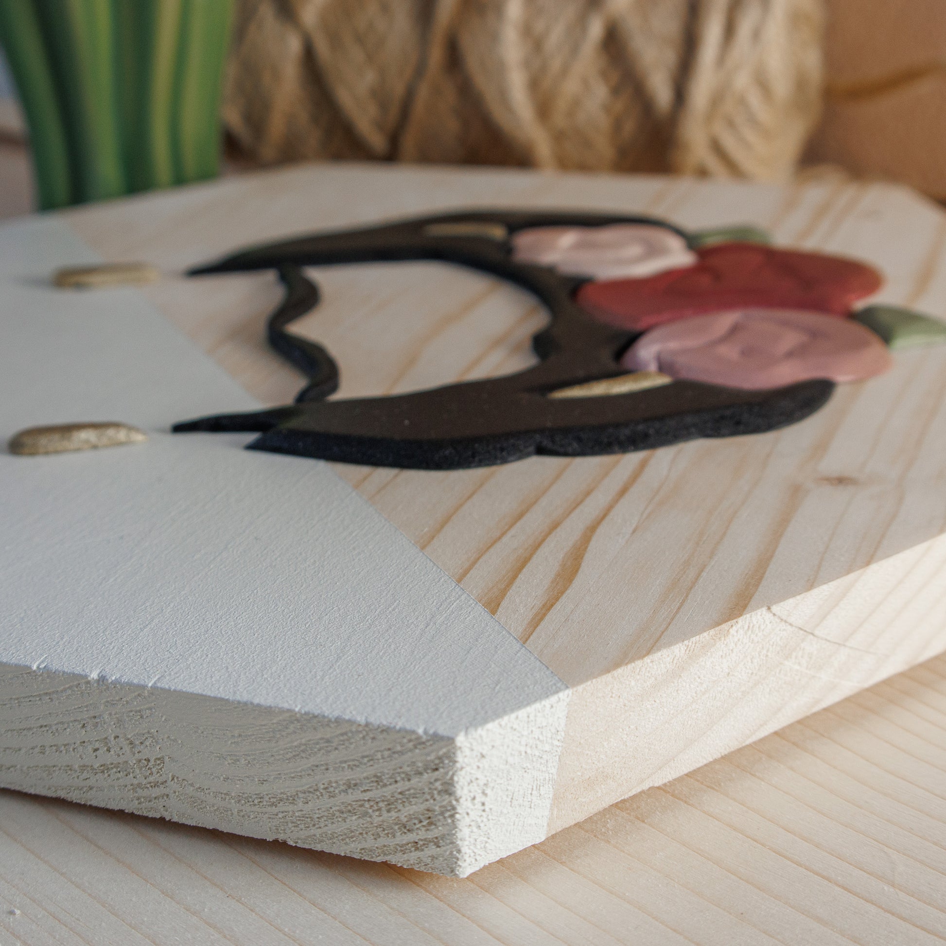Esagono in legno massello, decorazione in rilievo, scritta a mano libera.