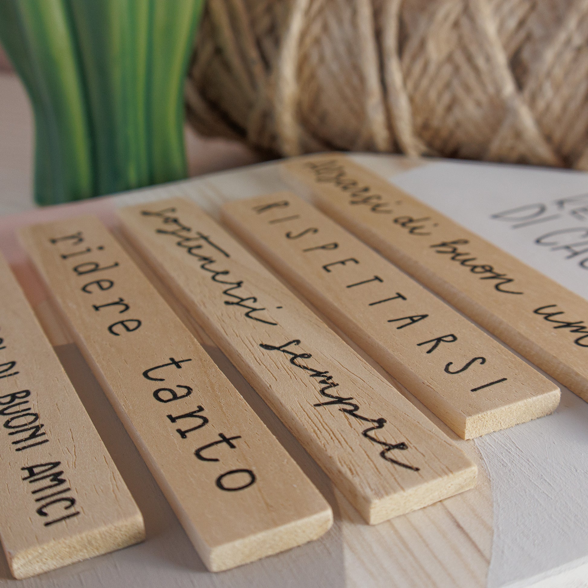 Casetta in legno massello, dipinta a mano. Targhette in rilievo decorate con scritta a mano libera.