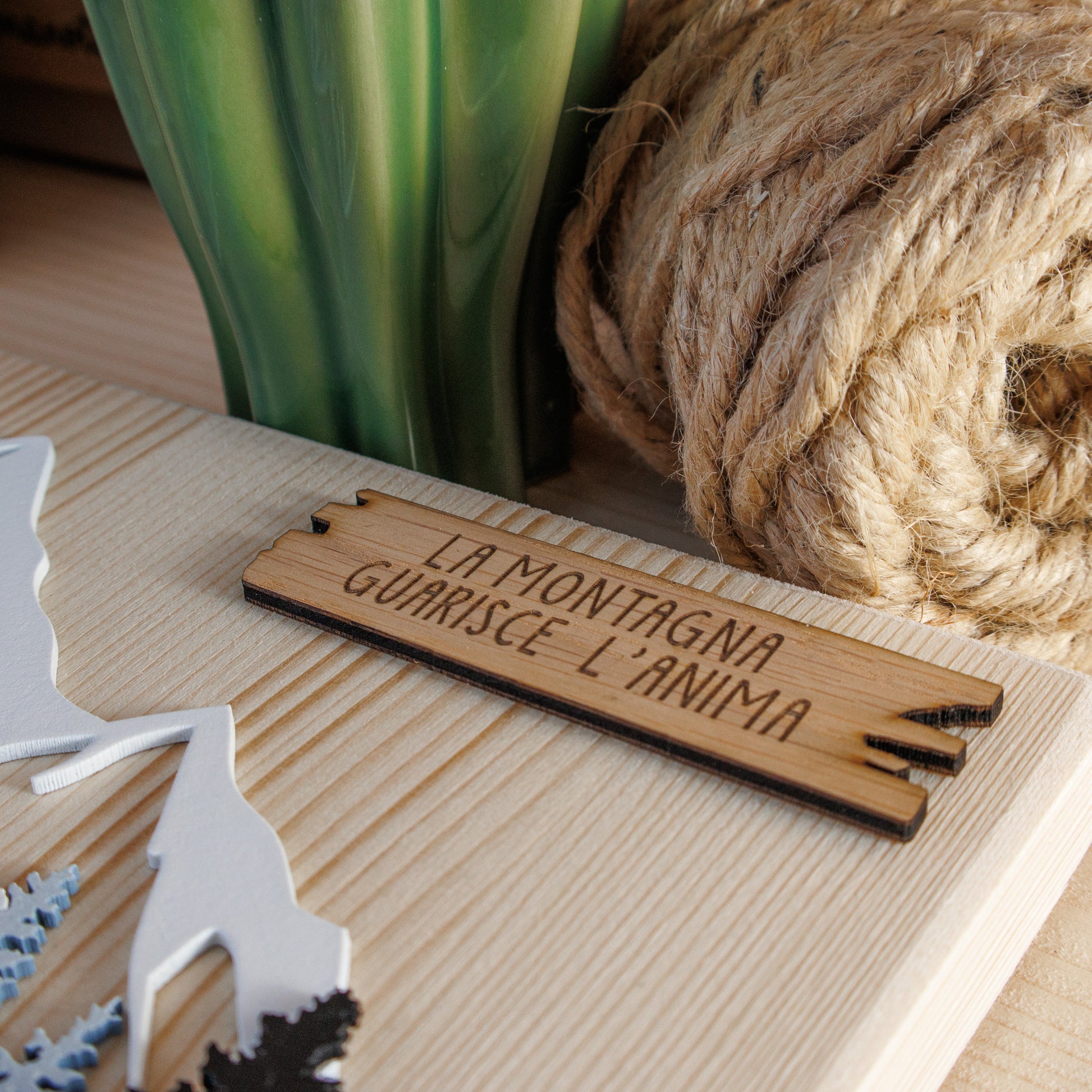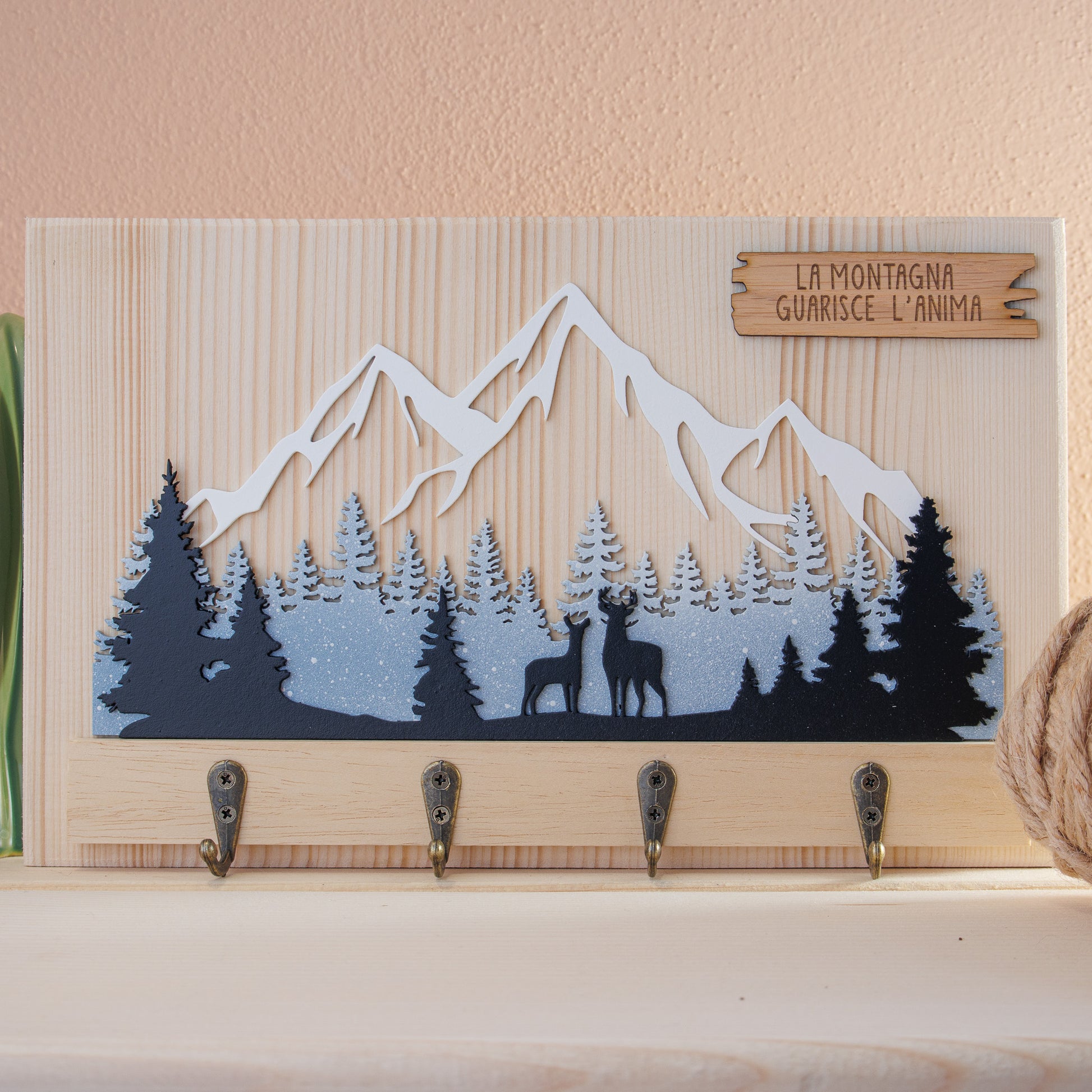 Portachiavi in legno massello con quattro ganci, decorazione in rilievo e targhetta in legno.