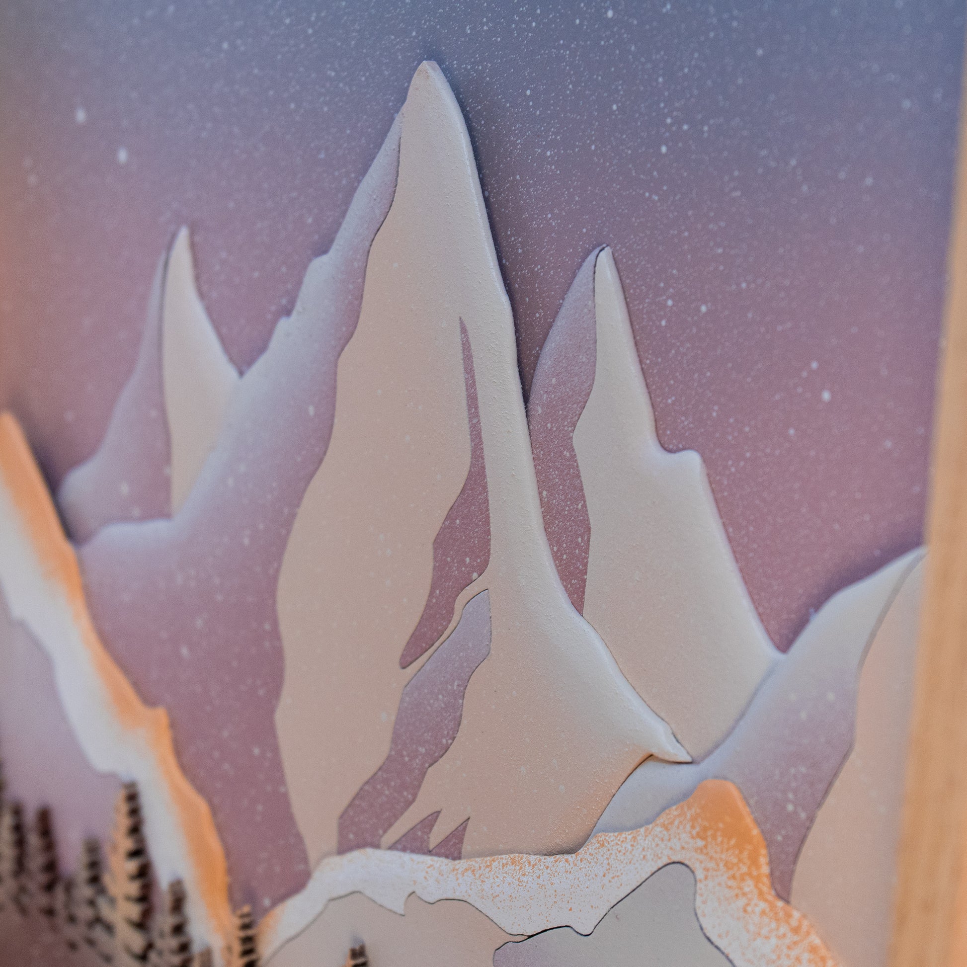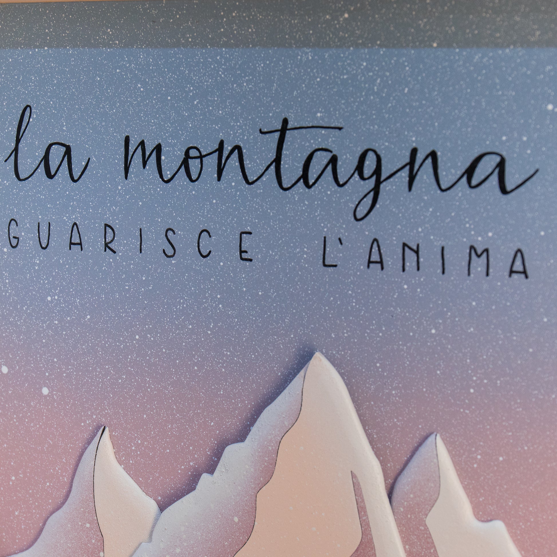 Quadro montagna con decorazione in legno, in rilievo su più livelli e scritta a mano libera.