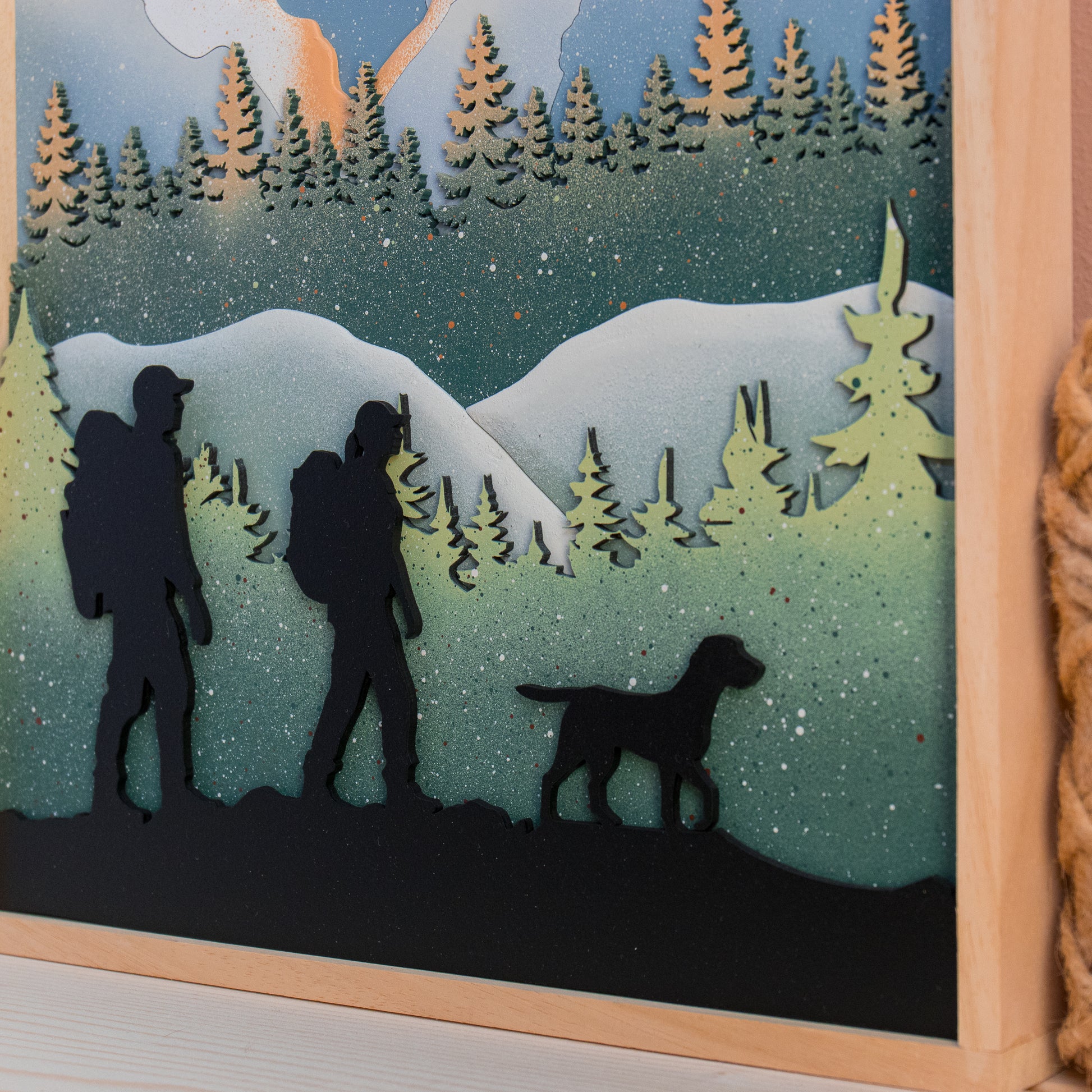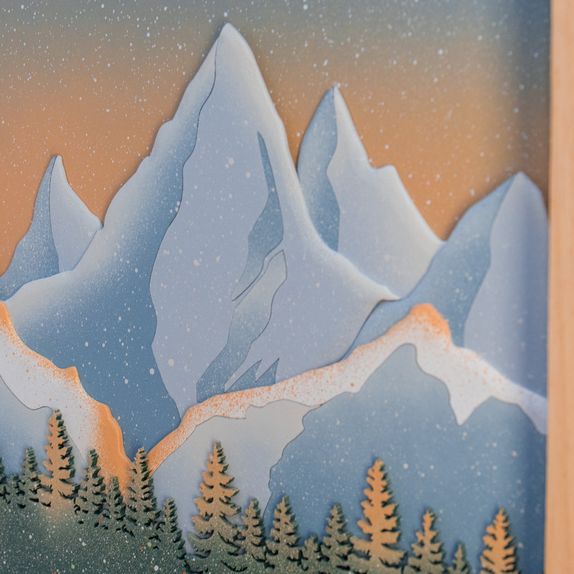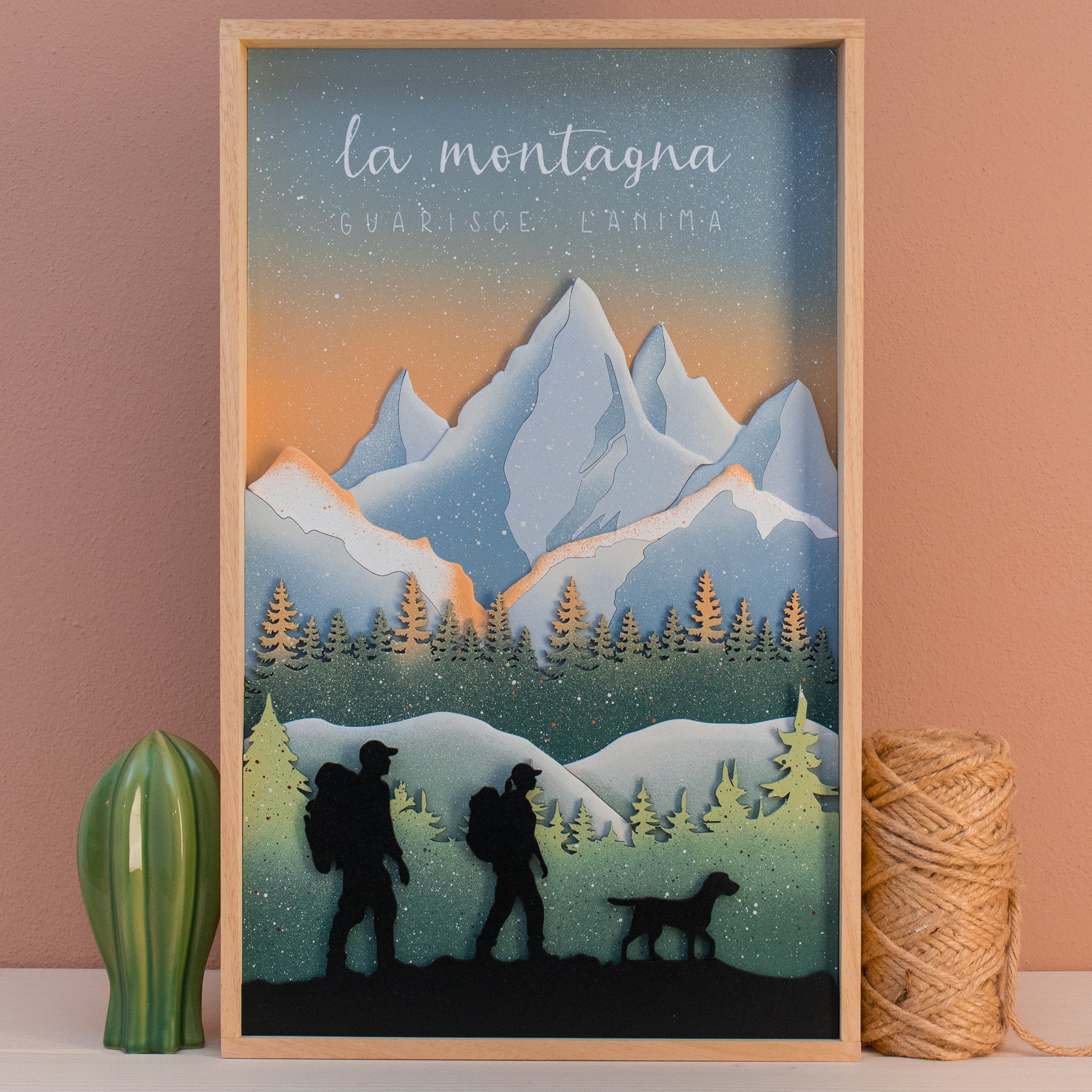 Quadro montagna con decorazione in legno, in rilievo su più livelli e scritta a mano libera.